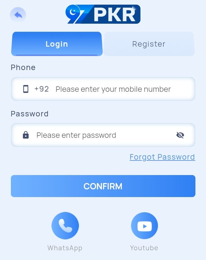 Start with the 97 PKR Login screen. Register with your phone number and set up a password.